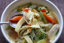 Stir in 3 cups chicken broth and 6 ounces chicken. Season with 1 pinch salt.