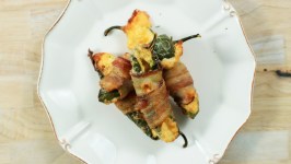 Cut 12 slices bacon slices in half. Wrap each stuffed jalapeño with half-slice of bacon.